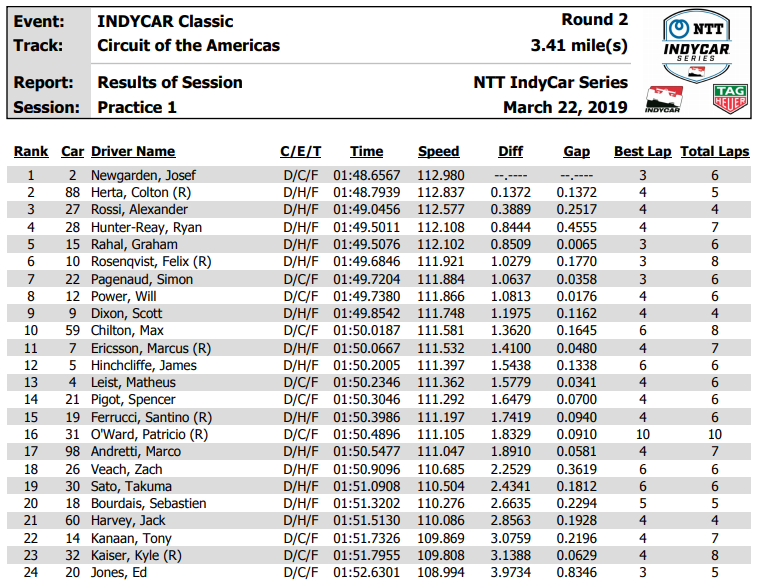 A sessão de abertura dos treinos livres no Circuito das Américas (COTA), mostrou a continuidade da boa fase de Josef Newgarden, da Penske, que acabou de vencer primeira corrida da temporada em St Petersburg. Newgarden liderou o primeiro treino livre no circuito texano com um tempo de 1m48.65s.