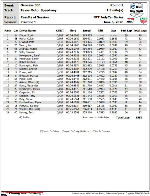O sábado de abertura da temporada começou no Texas, onde a Indy realizou seu único treino livre antes da corrida. Dentro da pista rolaram vários acidentes, reclamações e carros bem mais lentos que em 2019. O mais rápido da sessão foi o neozelandês Scott Dixon com 215.995 mph.